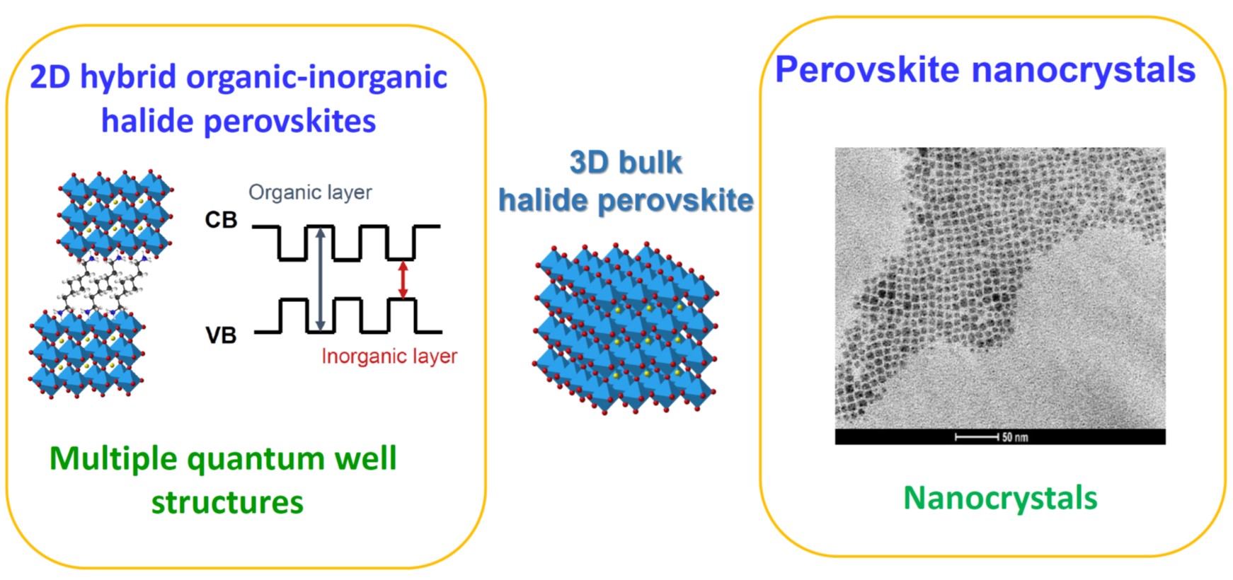 Organic–inorganic hybrid perovskites (OIHPs) have attracted a significant amount of attention for photovoltaic applications since their power conversion efficiency (PCE) has reached over 25%, which is already approaching the performance of commercial Si-based solar cells. The impressive PCE of OIHP photovoltaics is mainly attributed to their outstanding physical properties, such as a high optical absorption coefficient, low exciton binding energy and long and balanced electron–hole diffusion length. We have been working on perovskite solar cells for the past few years, not only for the device performance but also on the understanding of the fundamental mechanism. In addition, we have extensive research activities on the quantum structures of perovskite materials, including two-dimensional organic–inorganic hybrid perovskites (2D OIHPs), and perovskite quantum dots (0D).
