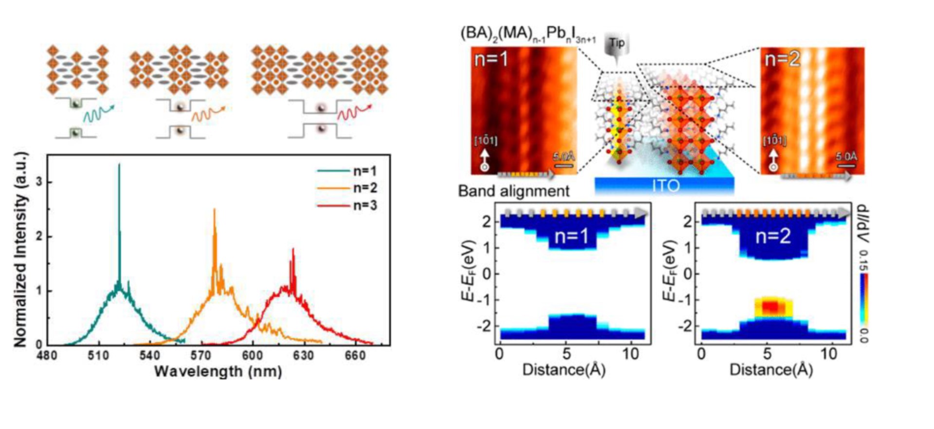 The 2D Ruddlesden−Popper perovskites (RPPs) have a naturally formed “quantum-well (QW)-like” structure consisting of inorganic perovskite layers of corner-sharing PbX6 octahedra sandwiched between organic spacers. The value of n is the number of inorganic perovskite layers per unit cell that determines the width of the QW and consequently the tunability of the optoelectronic properties of the 2D RPPs. We reported the growth of high-quality millimeter-sized single crystals. Low-threshold lasing behaviors with different emission wavelengths at room temperature have been observed from the homologous 2D hybrid RPP single crystals. (Nano Letters, 18, 3221, 2018) In addition, the atomically resolved quantum-confined electronic structures at organic−inorganic heterointerfaces of twodimensional (2D) organic−inorganic hybrid Ruddlesden−Popper perovskites (RPPs); this is accomplished with scanning tunneling microscopy (STM) and scanning tunneling spectroscopy (STS).(Nano Letters, 21, 8066, 2021) (Collaboration with Prof. Yap-ing Chiu (NTU))